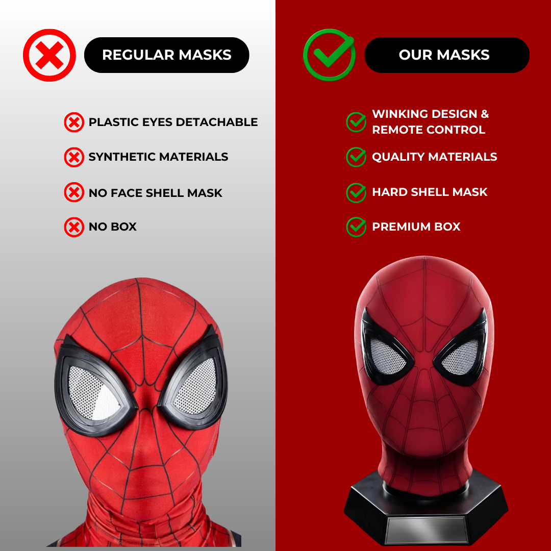 Unlike regular masks with detachable plastic eyes, synthetic materials, and no box, our mask offers winking control, quality hard-shell, and a premium display box.
