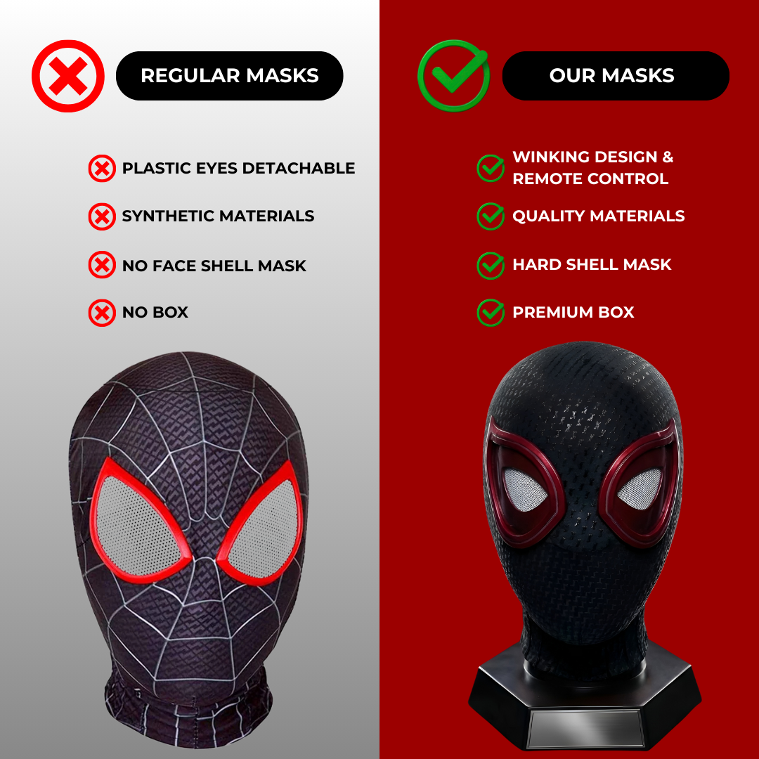 Unlike regular masks with detachable plastic eyes, synthetic materials, and no box, our mask offers winking control, quality hard-shell, and a premium display box.
