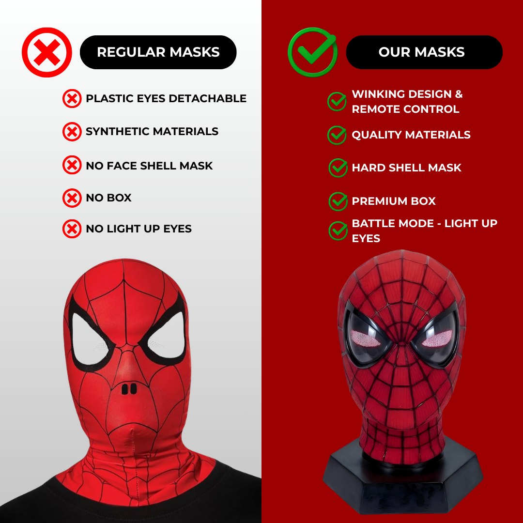 Unlike regular masks with detachable plastic eyes, synthetic materials, and no box, our mask offers winking control, quality hard-shell, and a premium display box.